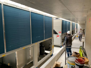 Another important aspect of this project was the need to ensure very low noise levels from the HVAC system installed, and have water-cooled chillers that could fit the narrow technical room. Those needs were met, in the case of the 2 Daikin EWWQ-G chillers, thanks to a customization specifically done for this project. The 2 units were installed in a stacked configuration, which reduced the footprint and allowed to use efficiently the space available. To guarantee very low noise levels, then, the compressors on the two units were enclosed in a special cabinet, which will allow these units to have the lowest possible noise levels.
