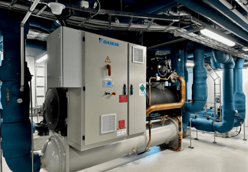 Daikin can provide a comprehensive range of advanced HVAC solutions tailored to meet specific demands. Recognizing that systems operate under partial loads for over 95% of the time, it integrates Variable Frequency Drives (VFDs) to help save energy, reduce wear on equipment, and improve system performance. Daikin also integrates its proprietary technologies, such as Variable Volume Ratio (VVR), into its single screw compressors to ensure optimal efficiency and adaptability to any changing conditions. To further enhance energy performance, Daikin chillers can be equipped with integrated active harmonic filters (AHFs), which reduce power distortions and improve overall system efficiency. These components are refrigerant-cooled and housed within the unit for maximum reliability.